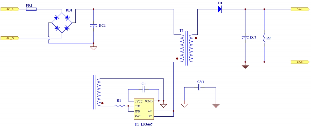 充電器的電路設(shè)計(jì)是其核心部分,其電路圖展示了各個(gè)元件的連接關(guān)系和功能。從電路圖中可以看出,該設(shè)計(jì)采用了典型的開關(guān)電源架構(gòu),主要包括輸入整流濾波電路、主控芯片 LP3667B、變壓器 T1、輸出整流濾波電路以及保護(hù)電路等關(guān)鍵部分。輸入整流濾波電路將交流輸入轉(zhuǎn)換為直流,并通過濾波電容去除高頻噪聲,為后續(xù)電路提供穩(wěn)定的直流輸入。主控芯片 LP3667B 作為整個(gè)充電器的“大腦”,負(fù)責(zé)控制開關(guān)頻率、占空比以及實(shí)現(xiàn)各種保護(hù)功能,確保充電過程的安全與高效。變壓器 T1 是實(shí)現(xiàn)電壓轉(zhuǎn)換和電氣隔離的關(guān)鍵元件,其三繞組結(jié)構(gòu)能夠有效降低電磁干擾并提高轉(zhuǎn)換效率。輸出整流濾波電路則將變壓器次級(jí)輸出的高頻脈沖轉(zhuǎn)換為穩(wěn)定的直流輸出,并通過濾波電容去除輸出紋波,保證輸出電壓的純凈度。