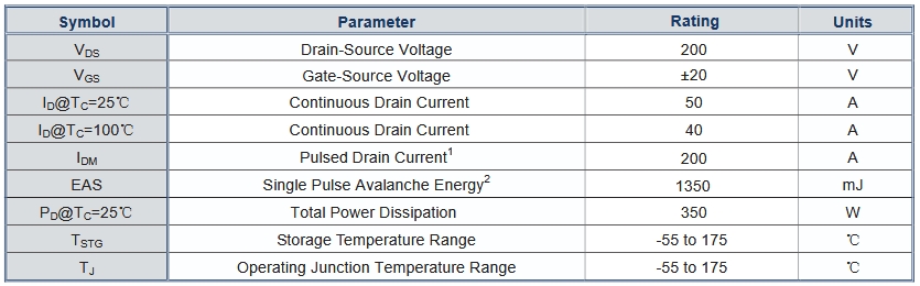 脈沖漏極電流(IDM):高達(dá)200A,能夠承受瞬間大電流沖擊,適用于需要快速脈沖電流的應(yīng)用場(chǎng)景。
