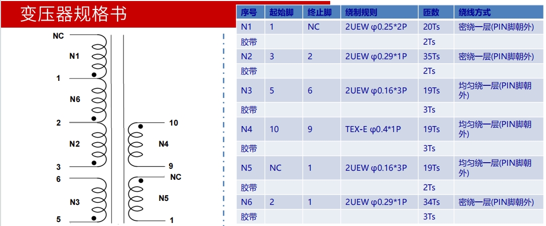 從繞制規(guī)則來看,變壓器采用了多繞組結(jié)構(gòu),包括初級繞組 N1、次級繞組 N2、輔助繞組 N3 等,每個繞組的匝數(shù)、繞線方式以及使用的線材規(guī)格都有嚴格的規(guī)定。例如,初級繞組 N1 采用 2UEW φ0.252P 的漆包線,匝數(shù)為 20Ts,密繞一層;次級繞組 N2 采用 2UEW φ0.291P 的漆包線,匝數(shù)為 35Ts,密繞一層等。