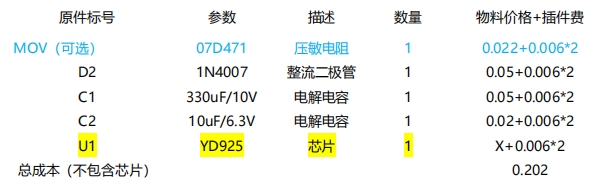 從 BOM 方案及成本來看,YD925 方案的物料種類大幅減少,且大多為貼片元件,尺寸小,可實(shí)現(xiàn)全貼片加工,極大地降低了生產(chǎn)成本和體積。以一個典型的 5V 輸出供電方案為例,YD925 的外圍電路簡潔明了,主要包括壓敏電阻(可選)、整流二極管、電解電容等常見元件,總成本(不包含芯片)僅為 0.202 元,相比傳統(tǒng)阻容降壓方案的 0.479+0.4 元,成本優(yōu)勢不言而喻。