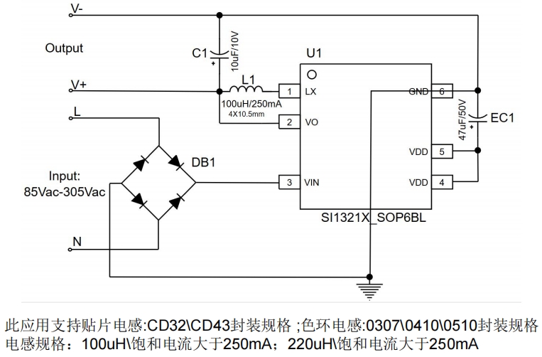 此應(yīng)用電路支持貼片電感(CD32/CD43封裝規(guī)格)和色環(huán)電感(0307/0410/0510封裝規(guī)格)。電感規(guī)格為100uH,飽和電流大于250mA;220uH,飽和電流大于250mA。