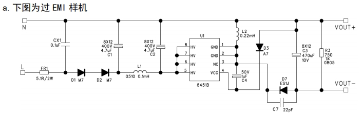 在效率方面,F(xiàn)T8451B表現(xiàn)出色。在115Vac和230Vac的滿載條件下,其效率分別可達(dá)62%和60%,這一效率水平在同類產(chǎn)品中處于領(lǐng)先地位。高效率不僅意味著能源的充分利用,還能有效降低能源損耗,符合現(xiàn)代節(jié)能理念。此外,F(xiàn)T8451B的EMI(電磁干擾)性能也得到了充分考慮,其傳導(dǎo)和輻射EMI均能達(dá)到相關(guān)標(biāo)準(zhǔn),如EN55022B和EN55013,確保電源在運(yùn)行過(guò)程中不會(huì)對(duì)周邊設(shè)備產(chǎn)生電磁干擾,也不會(huì)受到外界電磁干擾的影響,保障了整個(gè)系統(tǒng)的穩(wěn)定運(yùn)行。