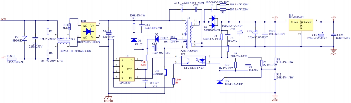 在主電路部分,BPA861AP芯片通過集成的高壓MOSFET實(shí)現(xiàn)開關(guān)功能,將輸入的交流電轉(zhuǎn)換為高頻脈沖信號,再經(jīng)過變壓器進(jìn)行隔離和降壓,最終通過整流濾波電路輸出穩(wěn)定的12V直流電壓。光耦和TL431組成的反饋電路能夠?qū)崟r(shí)監(jiān)測輸出電壓的變化,并將反饋信號傳遞給BPA861AP芯片,從而實(shí)現(xiàn)對輸出電壓的精確調(diào)節(jié)。