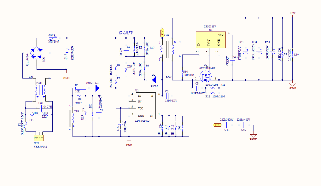 LP3799FAC的原理圖設計體現了其高度集成和優(yōu)化的特點。電路圖中,我們可以看到主要的電源管理IC(U1),以及與之配合的外圍元件,包括輸入濾波器、變壓器、輸出整流和濾波電路等。電路設計中還包含了多重保護機制,如輸入過欠壓保護、輸出短路保護、過溫保護等,確保電源方案的穩(wěn)定性和安全性。