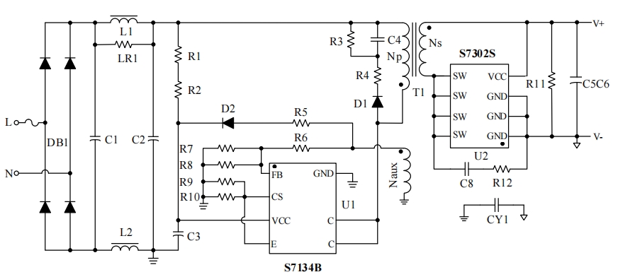 S7134B芯片的電路原理圖是其參考設(shè)計(jì)的核心部分,它詳細(xì)展示了芯片如何與其他電子元件協(xié)同工作,以實(shí)現(xiàn)恒壓恒流的電源輸出。以下是電路原理圖的簡(jiǎn)要說(shuō)明: