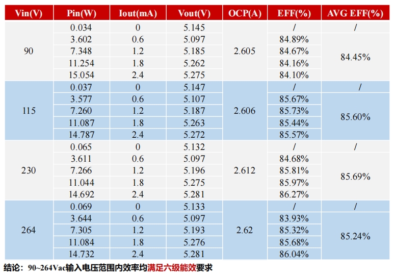 在90Vac至264Vac的輸入電壓范圍內(nèi),S7134B芯片的效率均滿足六級(jí)能效要求。具體數(shù)據(jù)如下表所示: