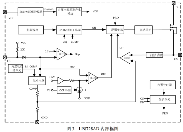 峰值電流控制模塊:通過(guò)CS引腳檢測(cè)開關(guān)電流,實(shí)現(xiàn)精確的電流模式控制。