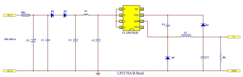 變壓器通過電磁感應將輸入的高電壓轉(zhuǎn)換為適合降壓轉(zhuǎn)換器處理的低電壓。在本方案中,變壓器將整流后的直流電壓轉(zhuǎn)換為適合LP2178B芯片處理的電壓水平,從而實現(xiàn)高效的降壓轉(zhuǎn)換。