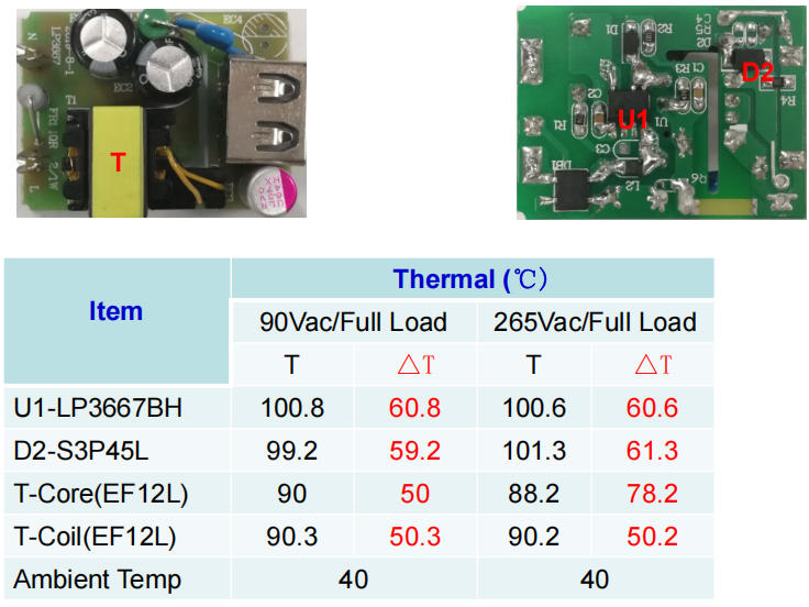 熱成像:40 ℃環(huán)溫,U1表面100.6 ℃,D2 101 ℃,EF12L磁芯90 ℃,全部<110 ℃。