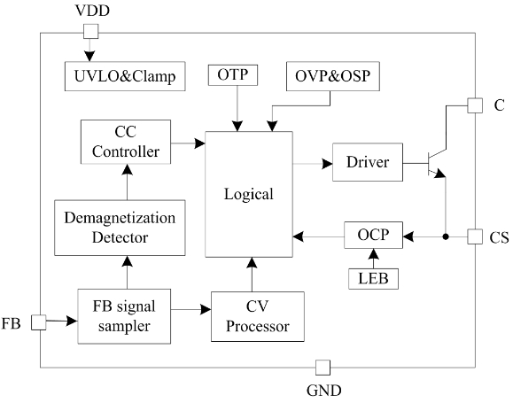 PL3378C同時(shí)具有多種保護(hù)功能:逐周期峰值電流檢測(cè)、VDD欠壓/過壓保護(hù)、輸出過壓保護(hù)、輸出短路保護(hù)和過溫保護(hù)等。