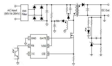 芯片通過對(duì)輸出采樣并反饋到光耦獲得高精度的恒壓輸出。內(nèi)置的斜串補(bǔ)償電路確保了峰值電流??刂频姆€(wěn)定性。內(nèi)部集成的頻率抖動(dòng)功能可以改善EMC.降低EMI濾波成本。