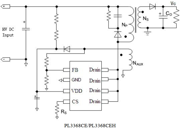 PL3368CE同時(shí)具有多種保護(hù)功能:逐周期峰值電流檢測(cè)、VDD 欠壓/過壓保護(hù)、輸出過壓保護(hù)、輸出短路保護(hù)和過溫保護(hù)等。