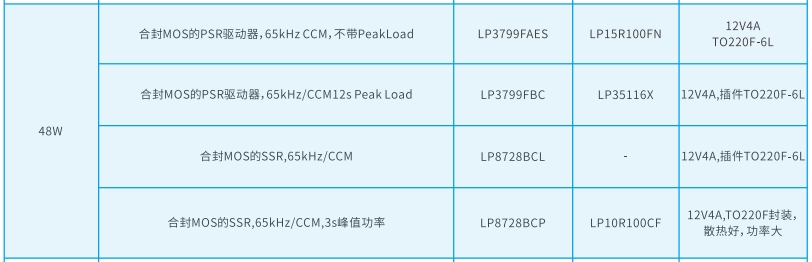 LP3799FAES:適用于65kHz連續(xù)導(dǎo)通模式(CCM)的PSR驅(qū)動器,不帶峰值負(fù)載功能。搭配LP15R100FN,提供12V4A的輸出能力。